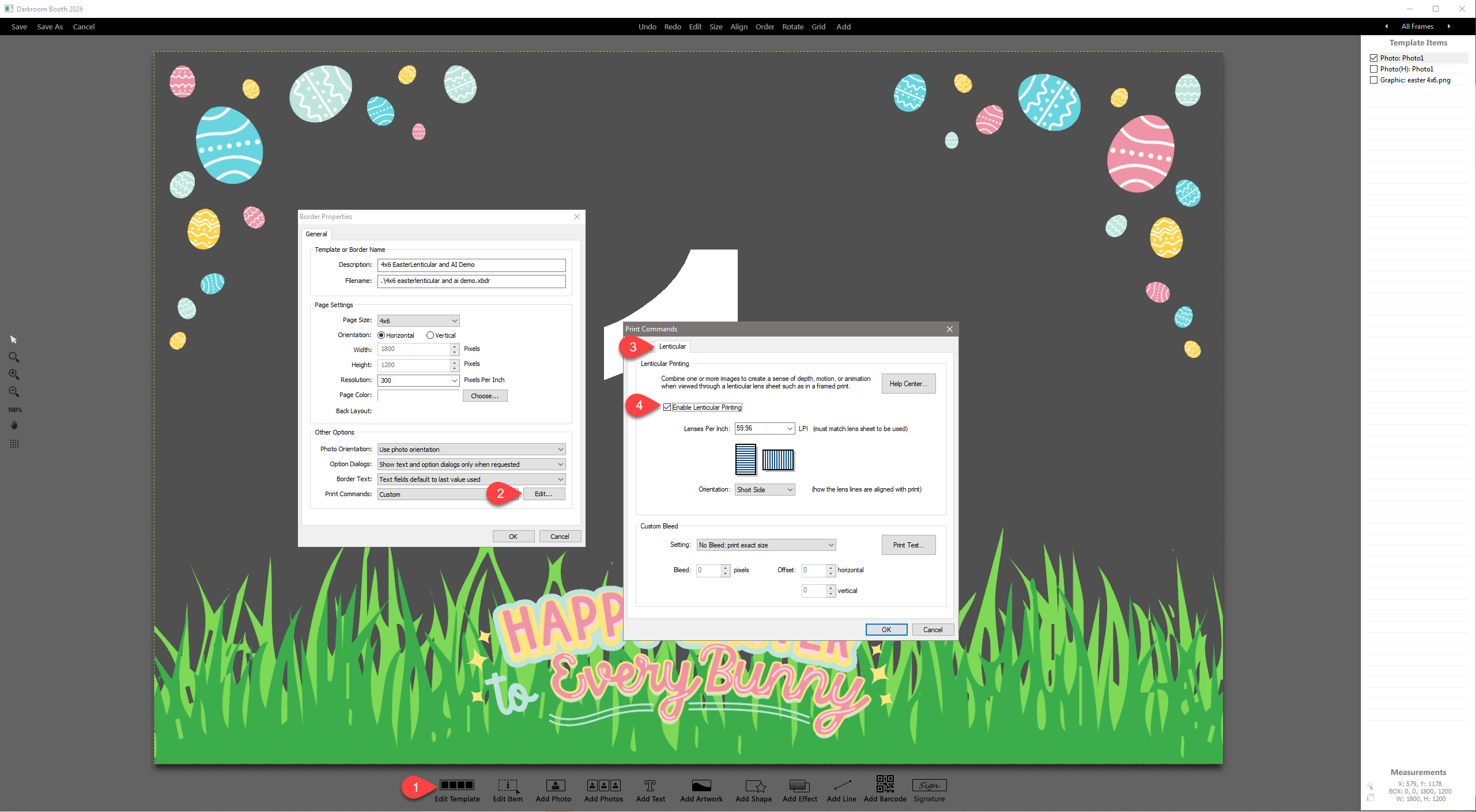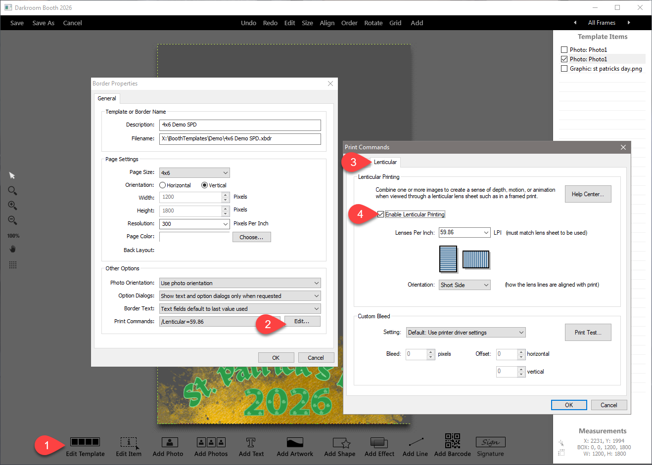 New Feature- Requires Booth 2025 3.01.1380 or higher Video Step by Step Instructions Click Edit Template Next to Print Commands, Click Edit Select the Lenticular Tab Enable lenticular printing and select the LPI (lines per inch) and orientation of ...