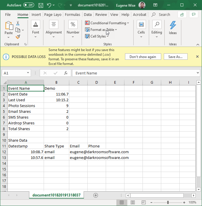 The event report contains: event name, event date, last used date, SMS shares, email shares, total shares. It also contains the date stamp for each share and the recipient (e.g. telephone number or email address).