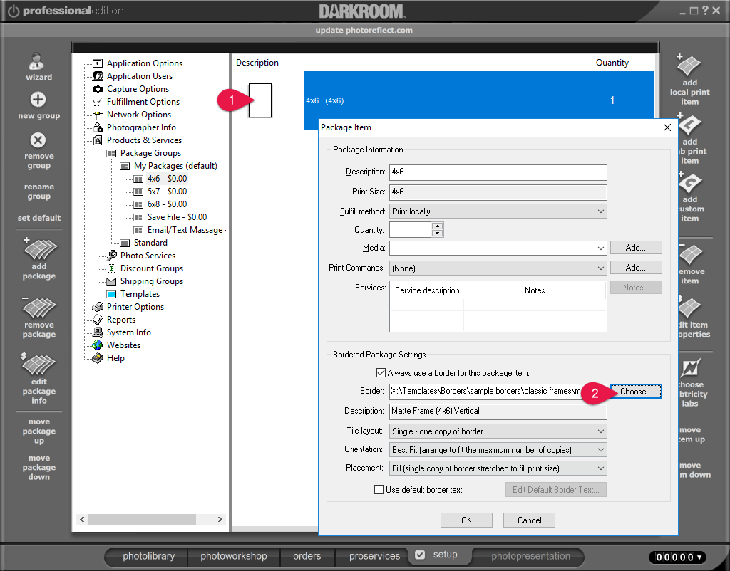 (1) With your package group selected in the Setup tab, click Add Package. (2) Give the package a name. (3) you can check the option for quick print so that it processes a little faster. (4) Click Add Local Print Item (5) Select the Digital Delivery ...
