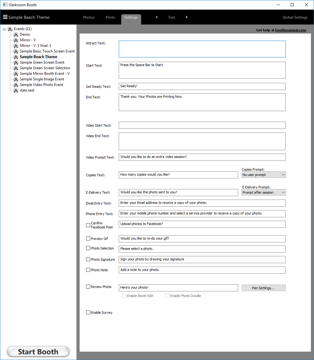 1. Text fields - Booth screen templates can have text placeholders for these text fields. For example, a screen can have a text box containing %endtext% and the contents of the End Text field will be entered there. Placeholders like %countdown text% allow control of how, where, when and the font that text will appear on the screen. For example, a text box containing %end text% will have the text from the End text field inserted in the selected font and location. Placeholders can be inserted to