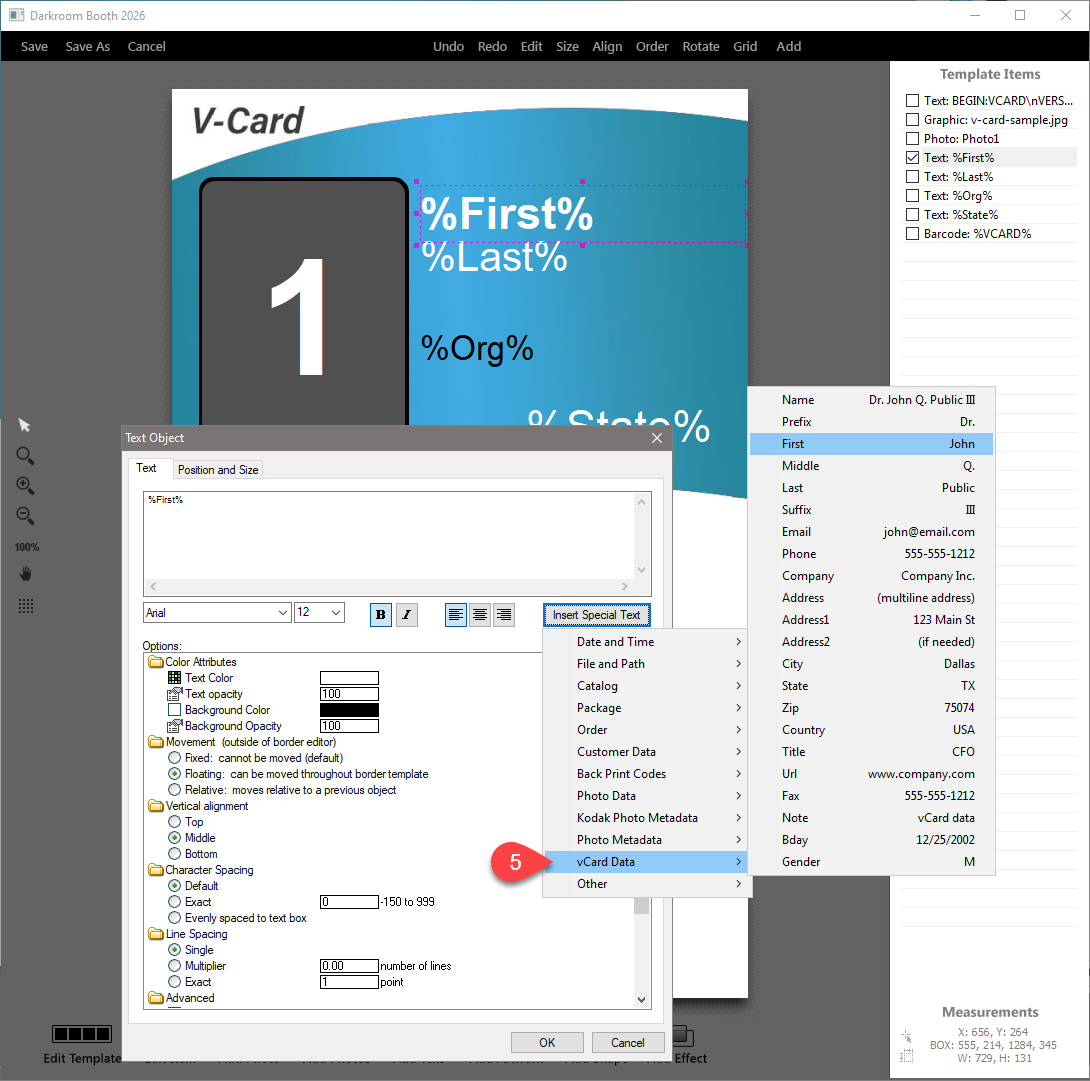 5. You can add the data that is captured from a v-card under the "Insert Special Text" options